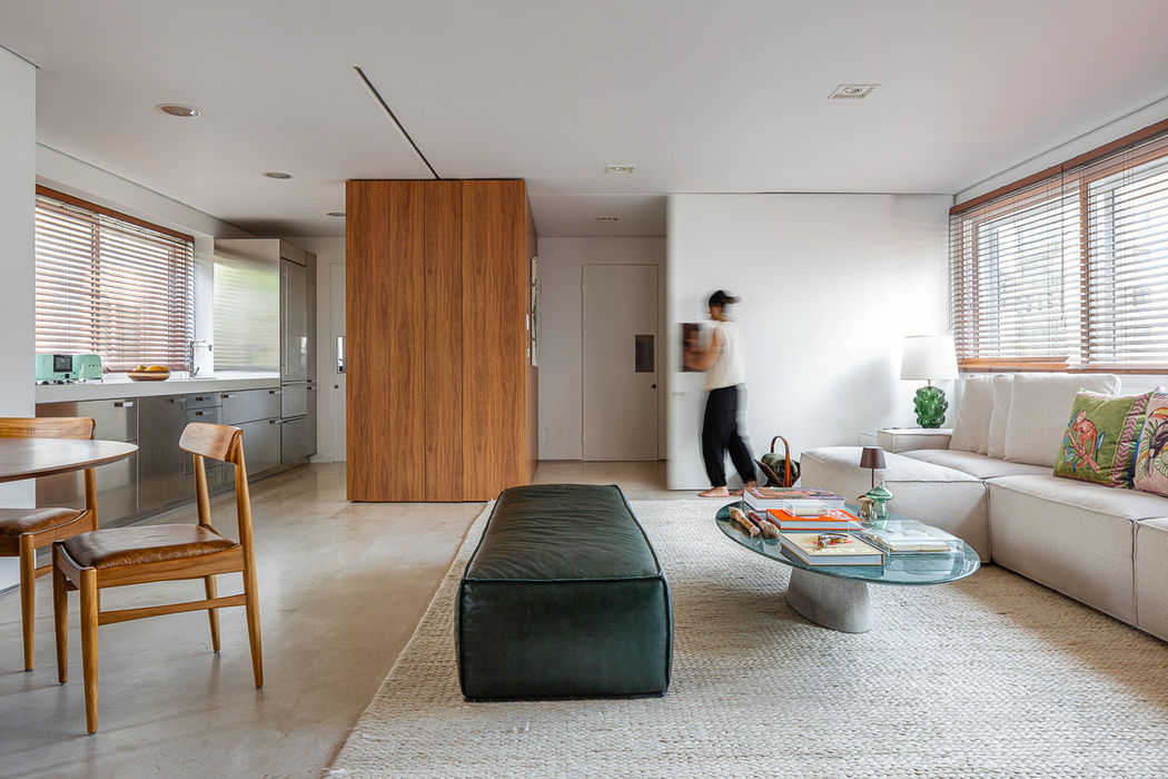 Na reforma deste apartamento, um morador amante de livros deu a inspiração para que a bilbioteca fosse a atração principal e dividisse os ambientes. Em uma base neutra, a marcenaria torna a luz permeável pelos outros espaços do apartamento.