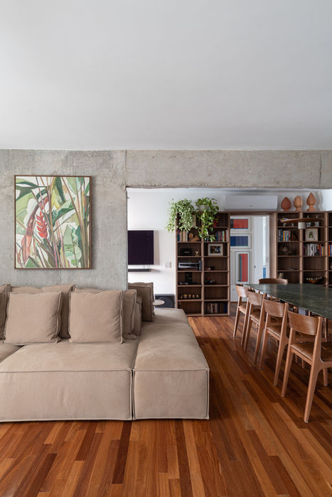 No Apto Perdizes, a ampla integração dos ambientes assume a viga exposta como um ato estrutural e protagonista.