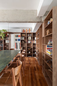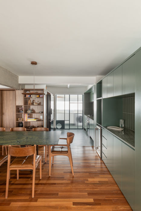 Uma estante de marcenaria contínua atravessa a planta, organiza usos e costura unidade entre os espaços. A madeira e o verde criam contraste e equilíbrio: calor material, frescor vegetal e textura no cotidiano.