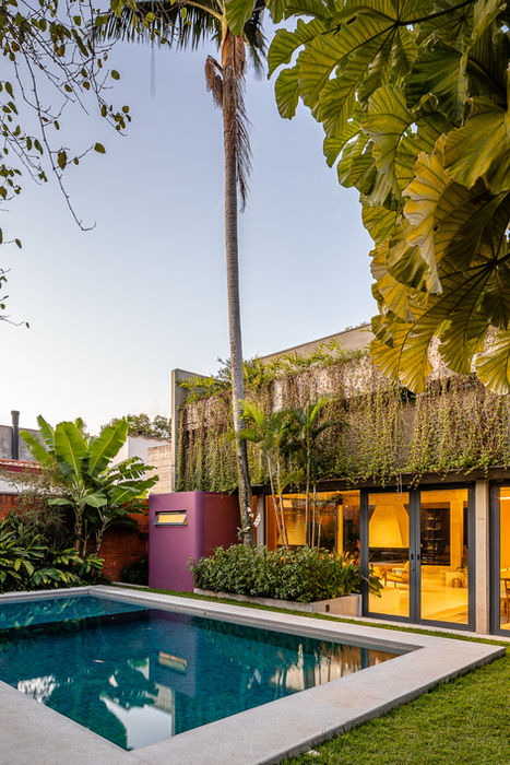 A implantação da casa explora o desnível do terreno para criar uma relação fluida com o jardim e o entorno.